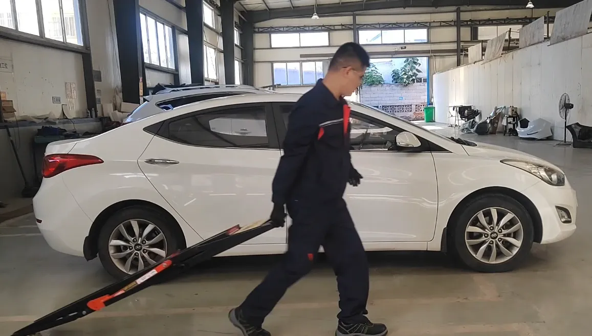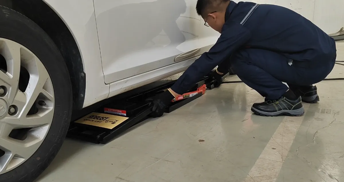Drag the lift to both sides of the vehicle (no personnel in the car and no heavy objects on the side of the vehicle) to ensure that the safety lock lever of the lift is on the outside of the vehicle, which is convenient for personnel to operate. Move the lift to the underside of the vehicle skirt, adjust and determine the lifting position, try to ensure that the front, rear, left and right directions of the lifts are parallel, and put the rubber blocks.